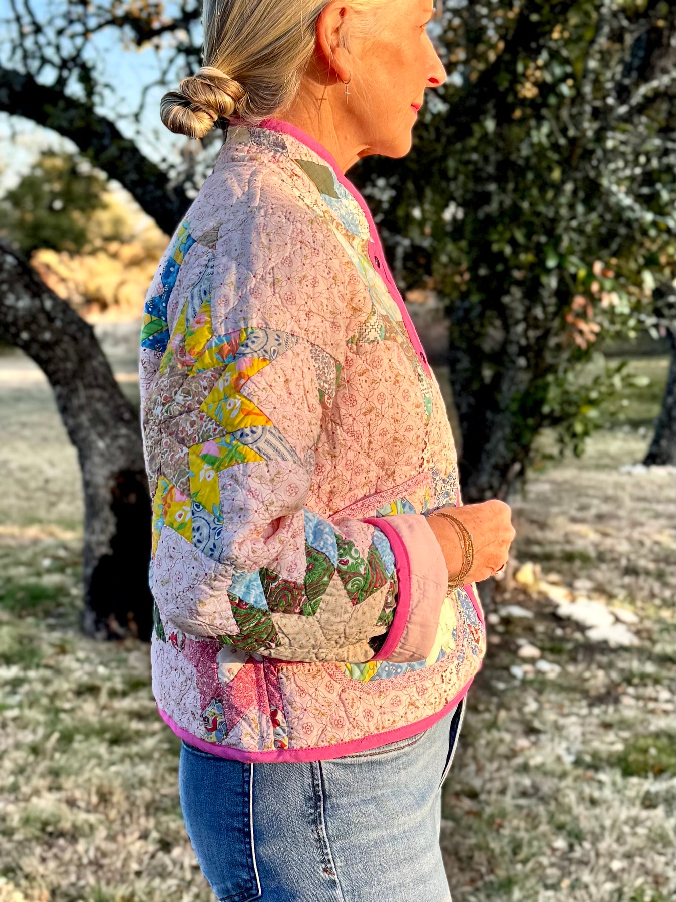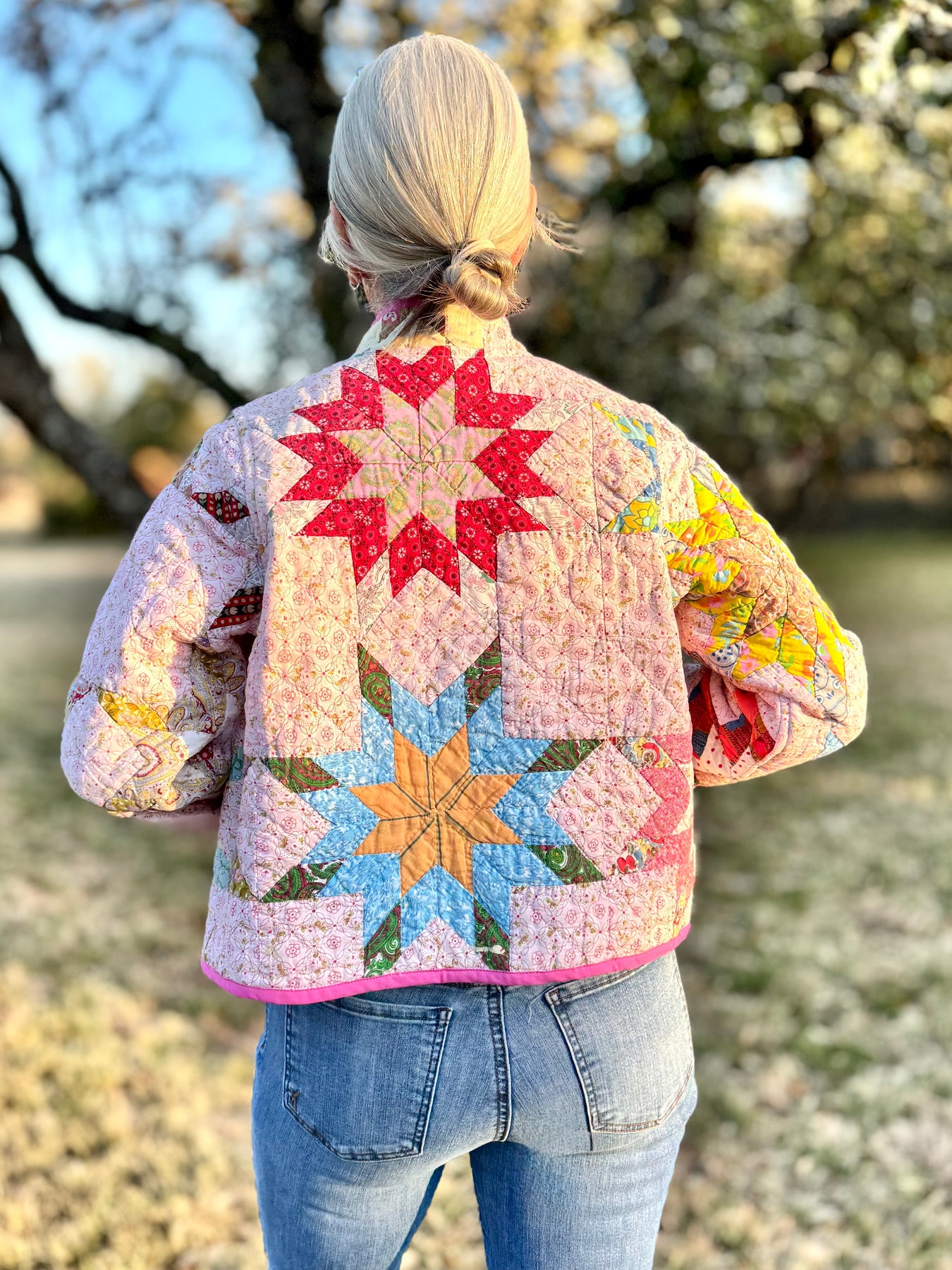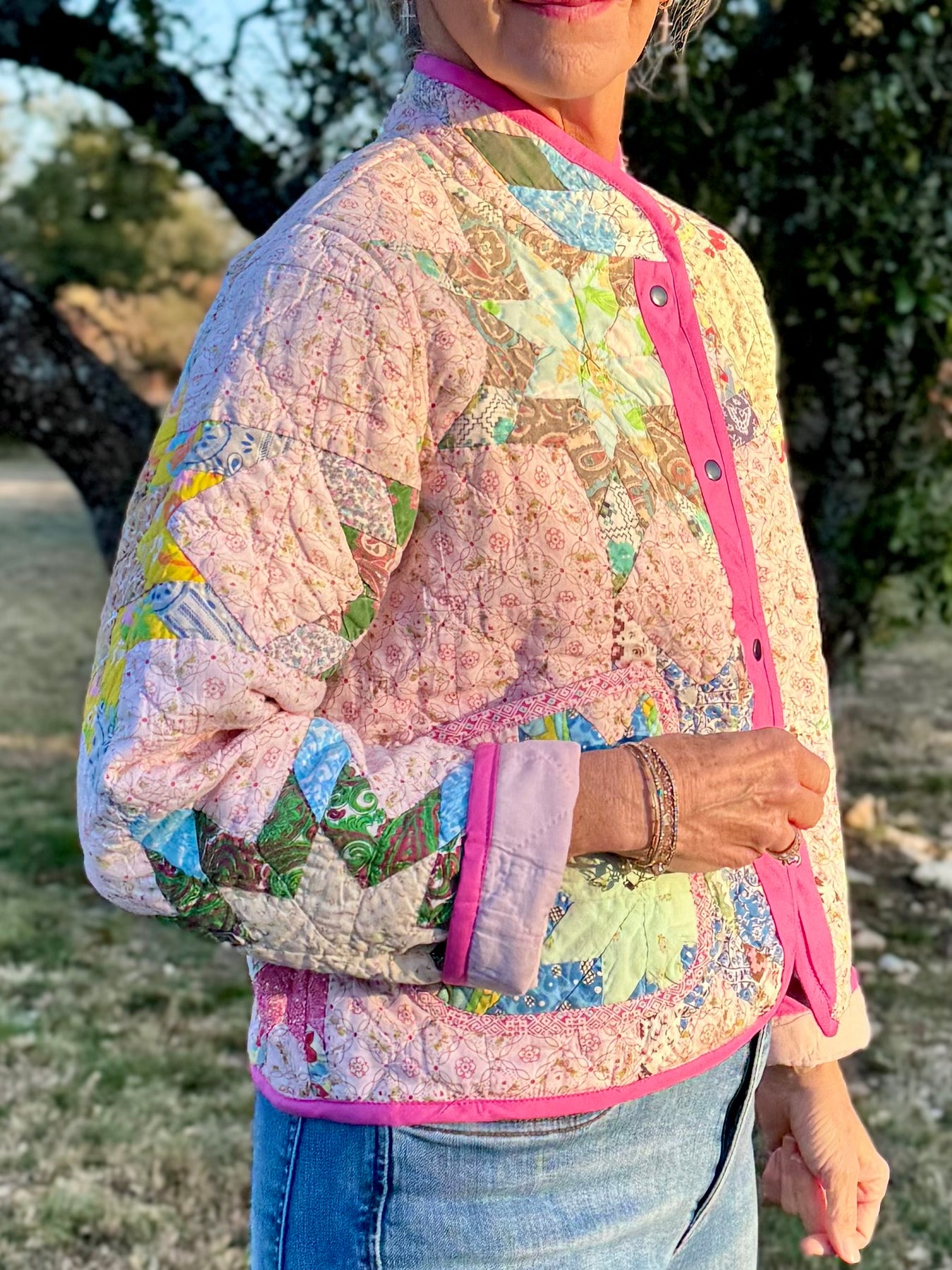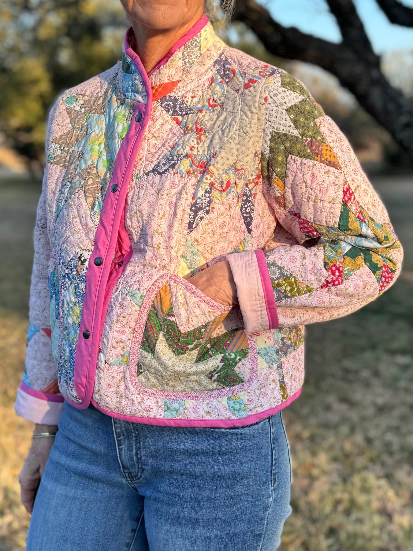 Patches on Point Shorty Chore Coat with Mandarin Collar by Lottie Dal - Floral Trim