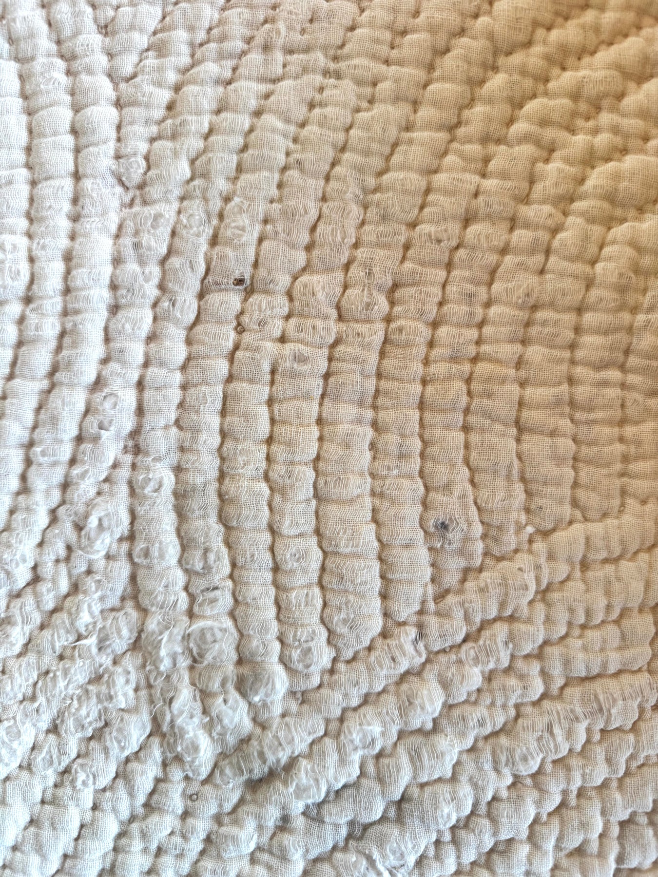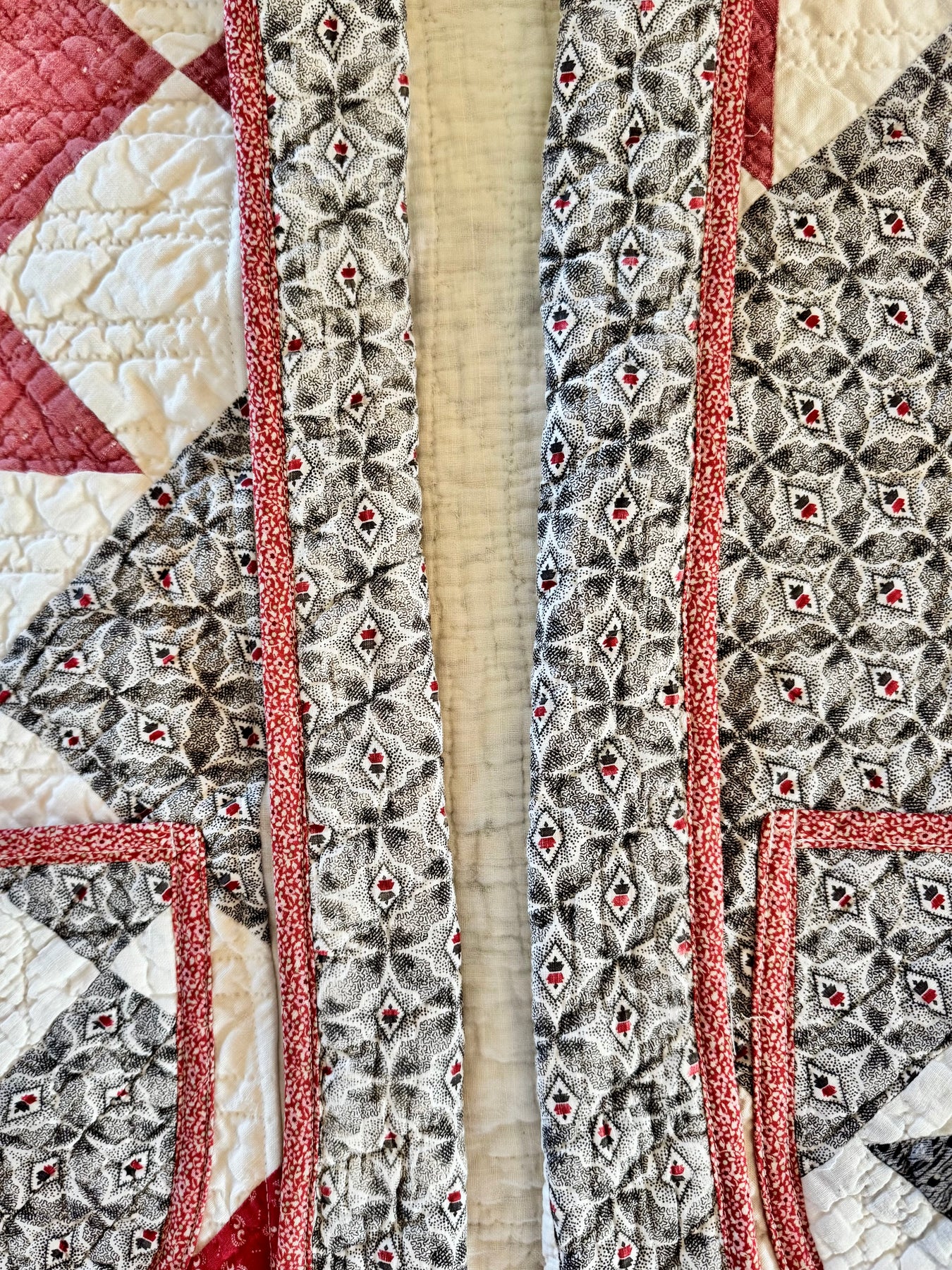 Take a peak at that Baptist fan quilting! And no, those aren’t bugs you’re seeing in the batting. Those are cotton burrs, remnants of hand-carded batting customarily used before batting was mass manufactured.