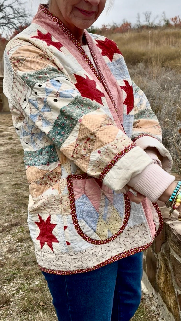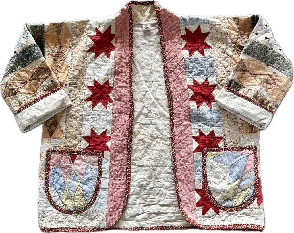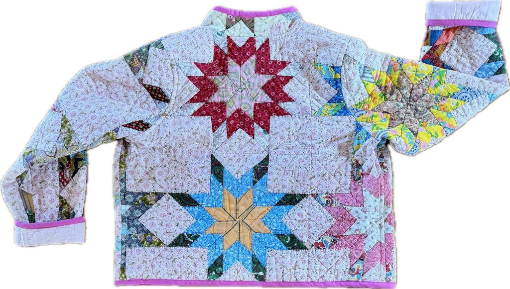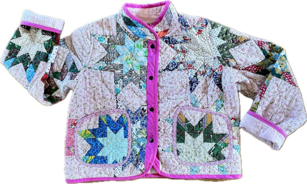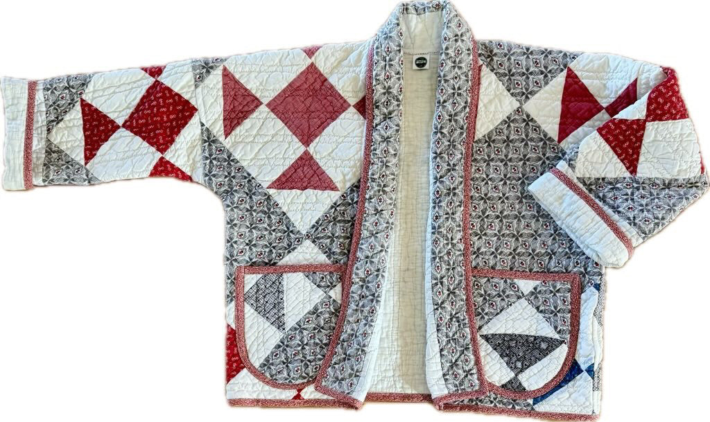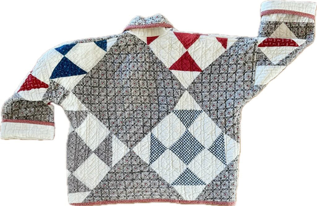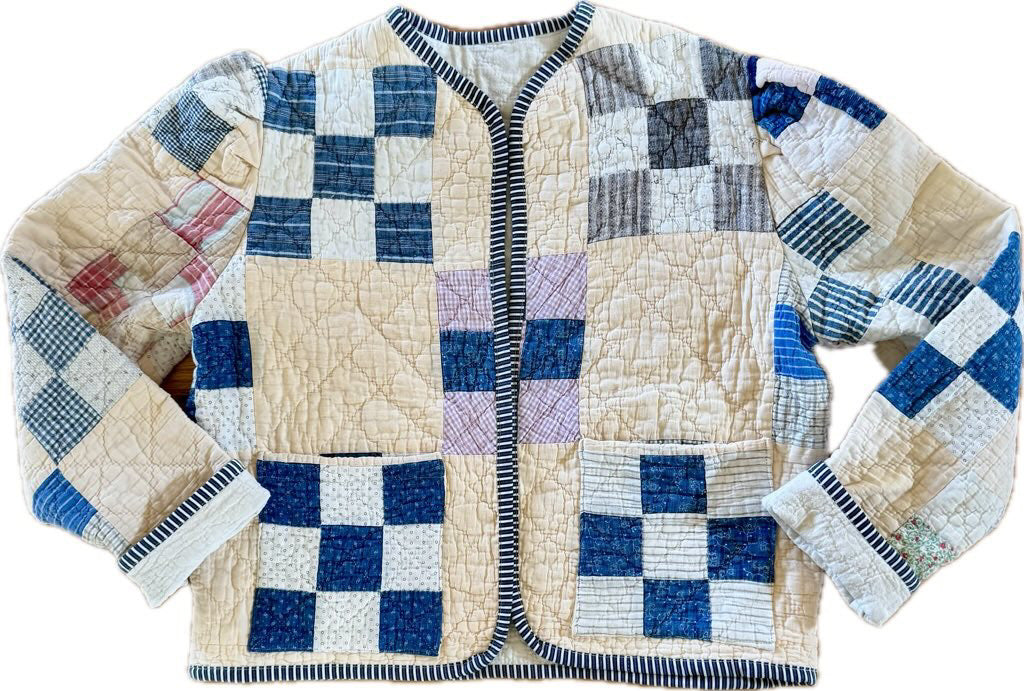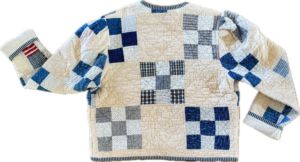 Made from a late 1800’s hand-pieced and hand-quilted patchwork quilt, this upcycled chore coat is replete with indigos, shirting fabrics, and calicos. It’s a medium/heavy weight jacket to keep the winter chill away.