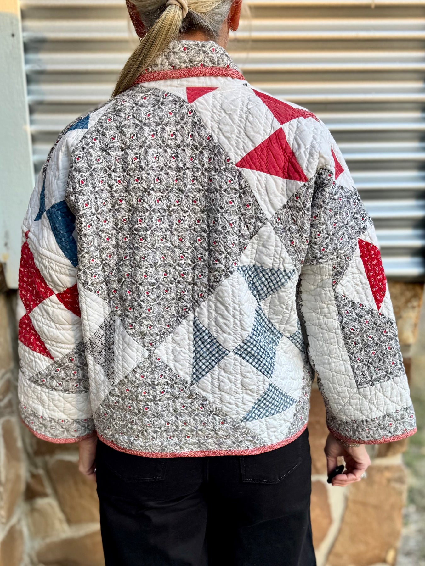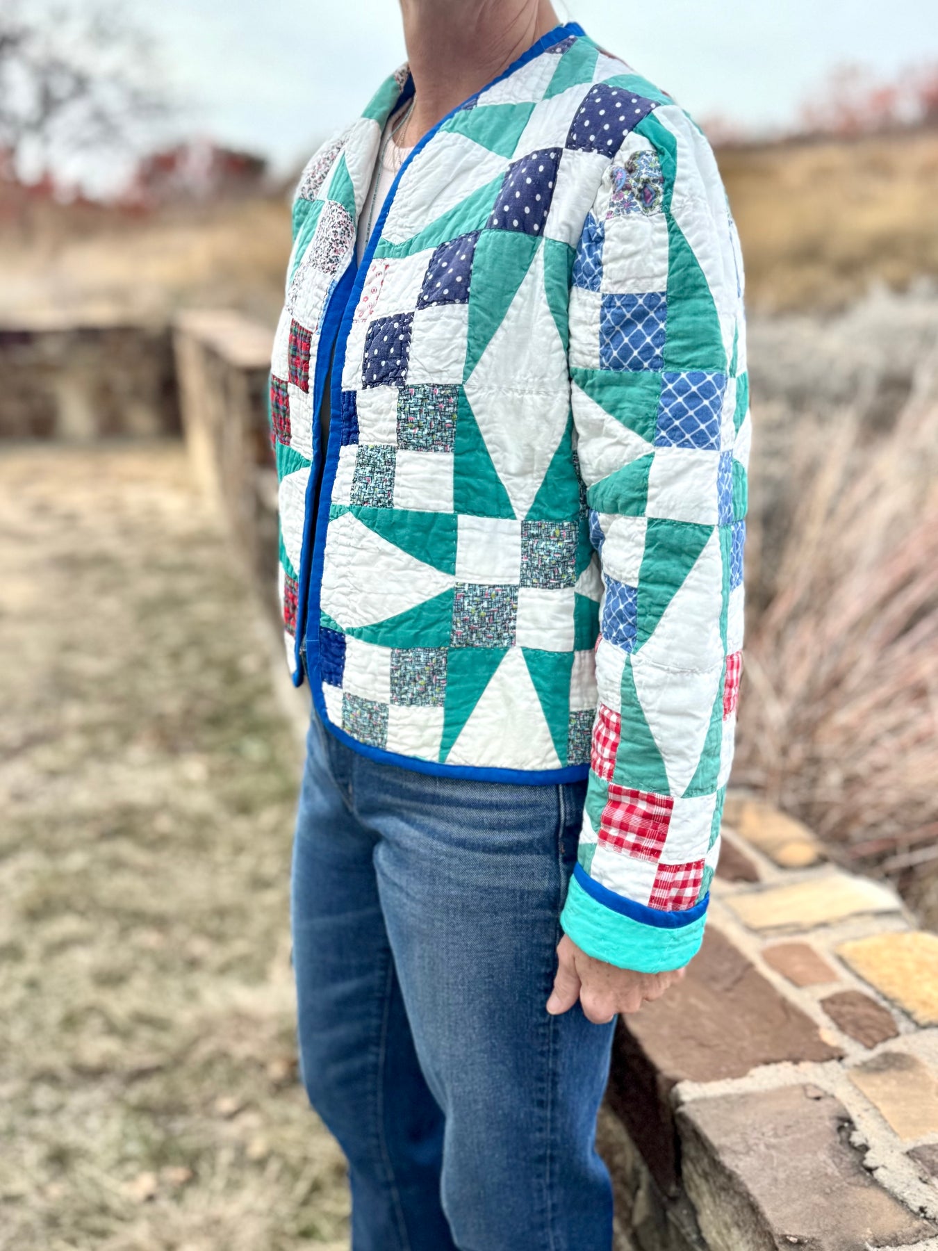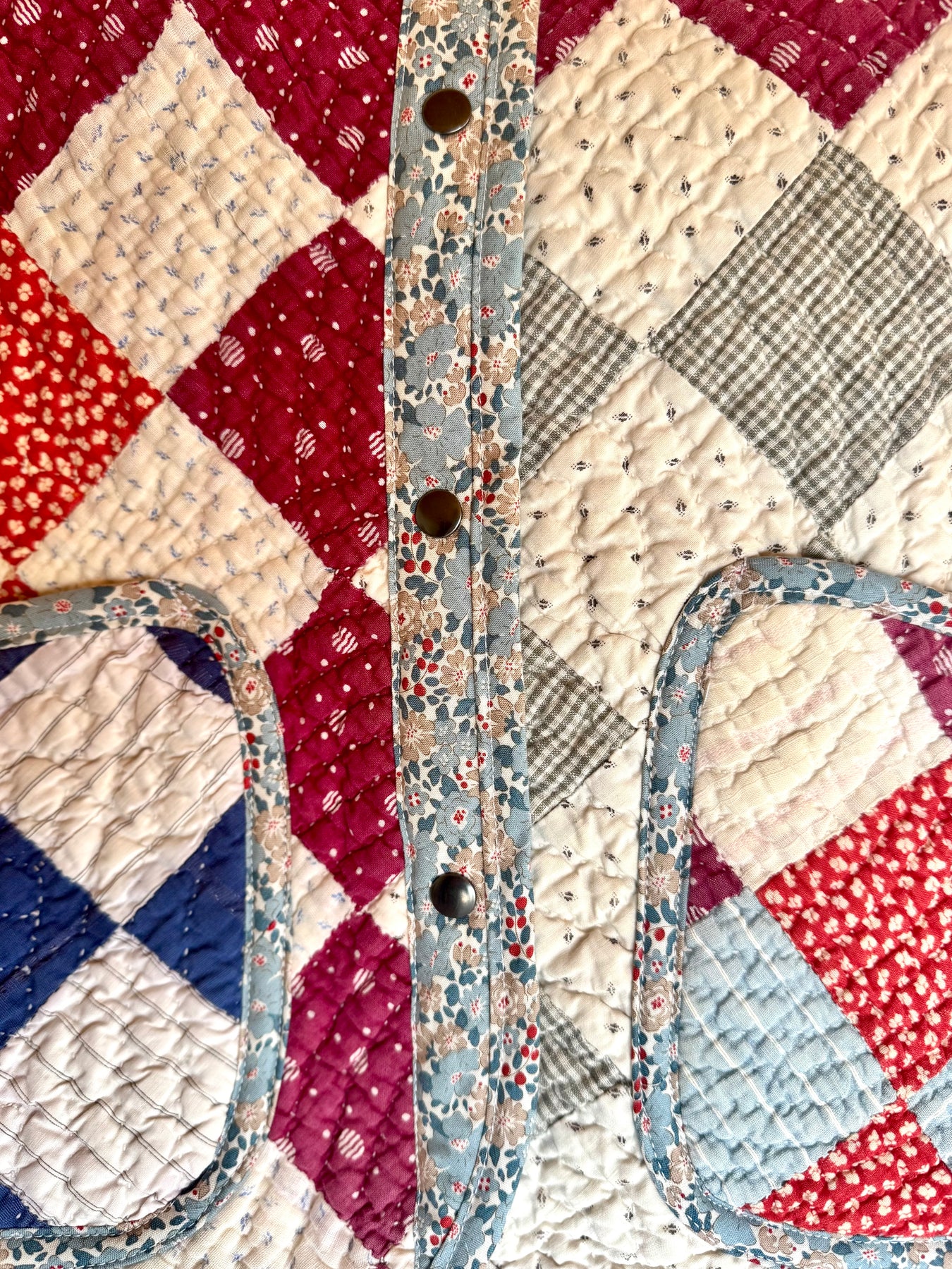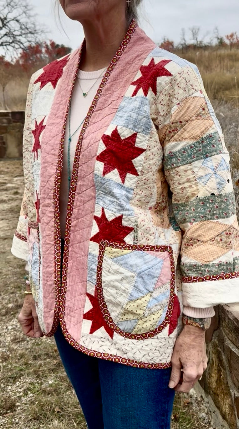 Made from a late 1800’s hand-pieced and hand-quilted patchwork quilt, this upcycled chore coat is replete with indigos, shirting fabrics, and calicos. It’s a medium/heavy weight jacket to keep the winter chill away.