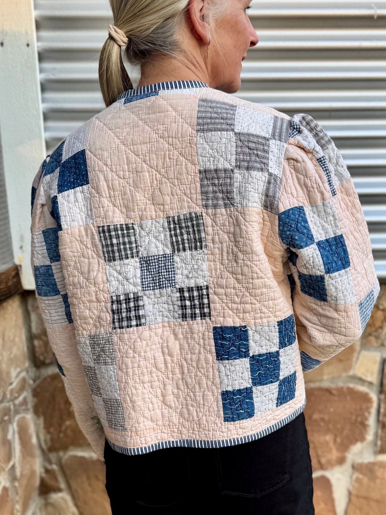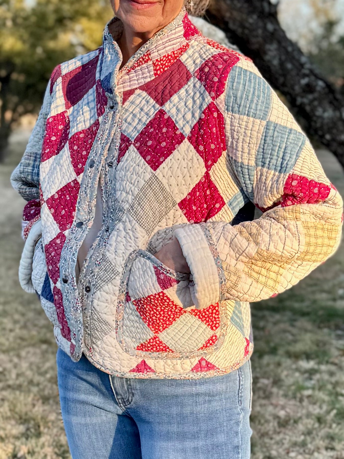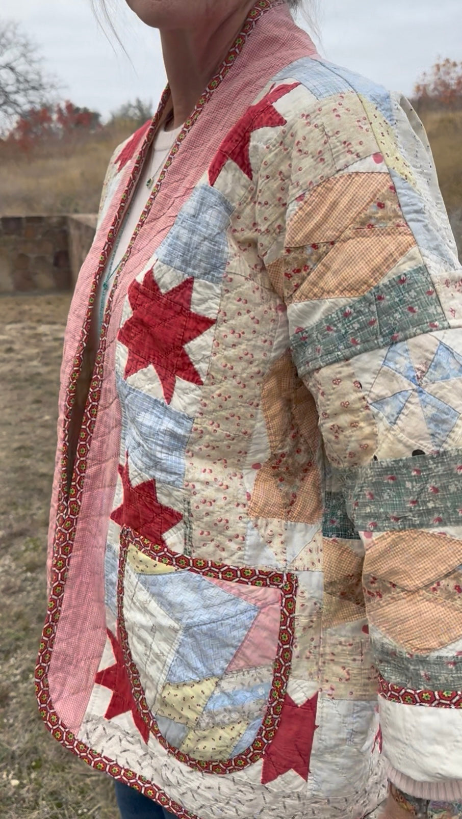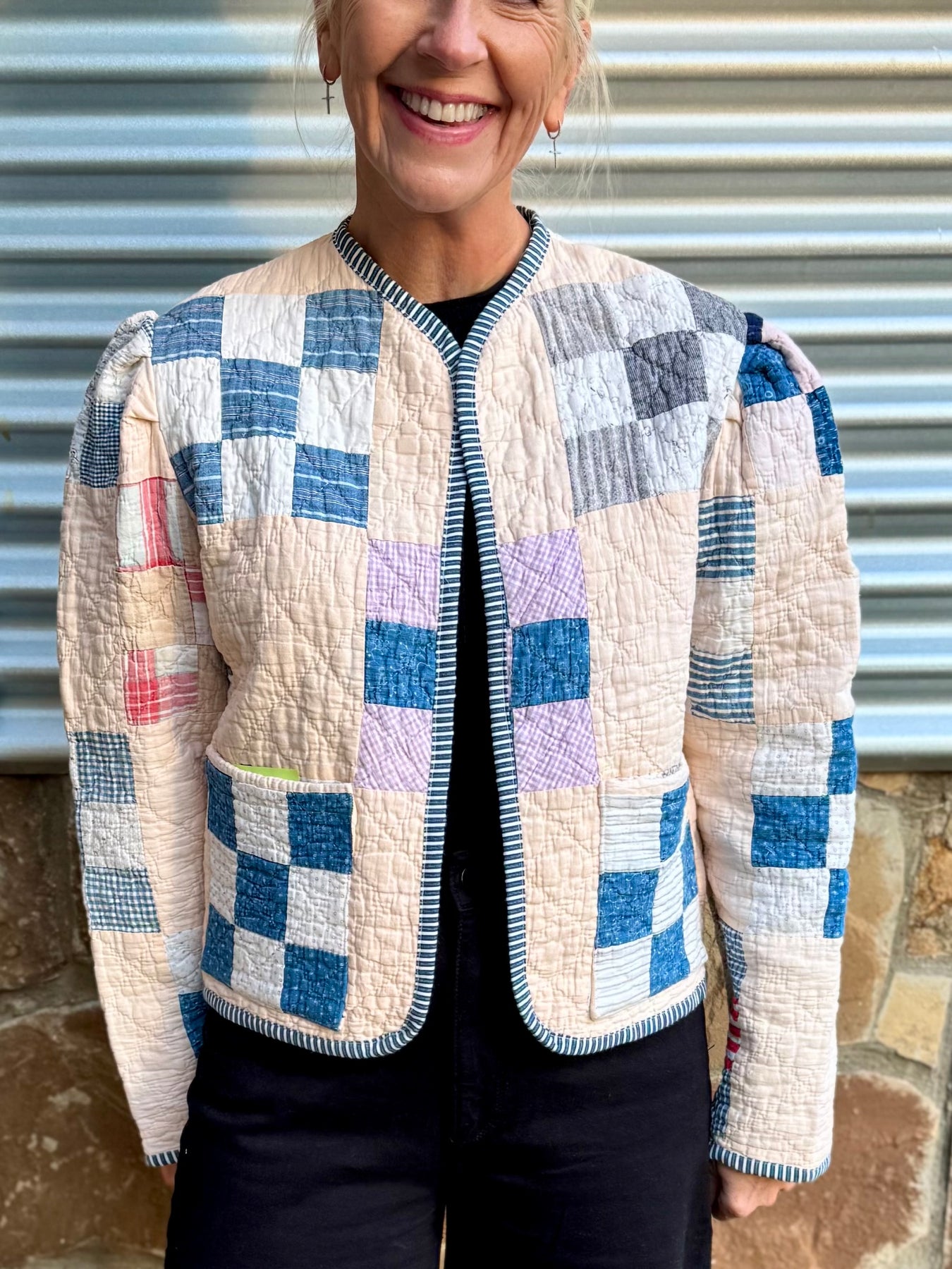 Made from a late 1800’s hand-pieced and hand-quilted patchwork quilt, this upcycled chore coat is replete with indigos, shirting fabrics, and calicos. It’s a medium/heavy weight jacket to keep the winter chill away.