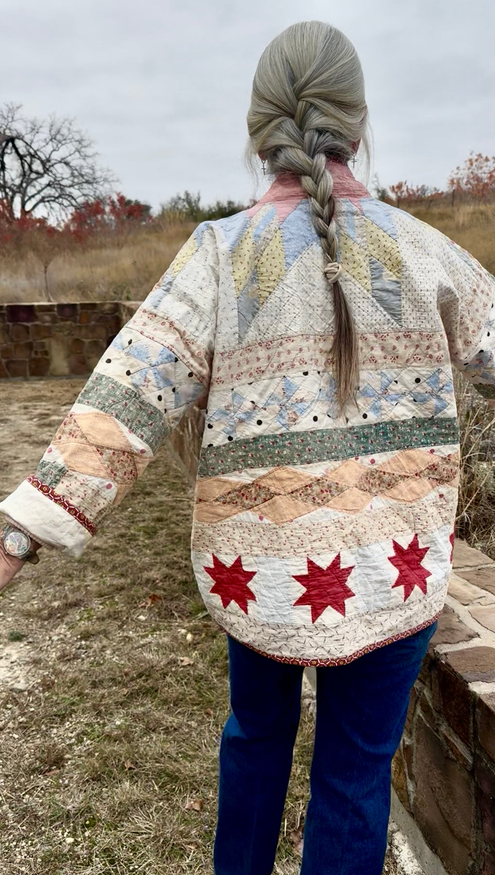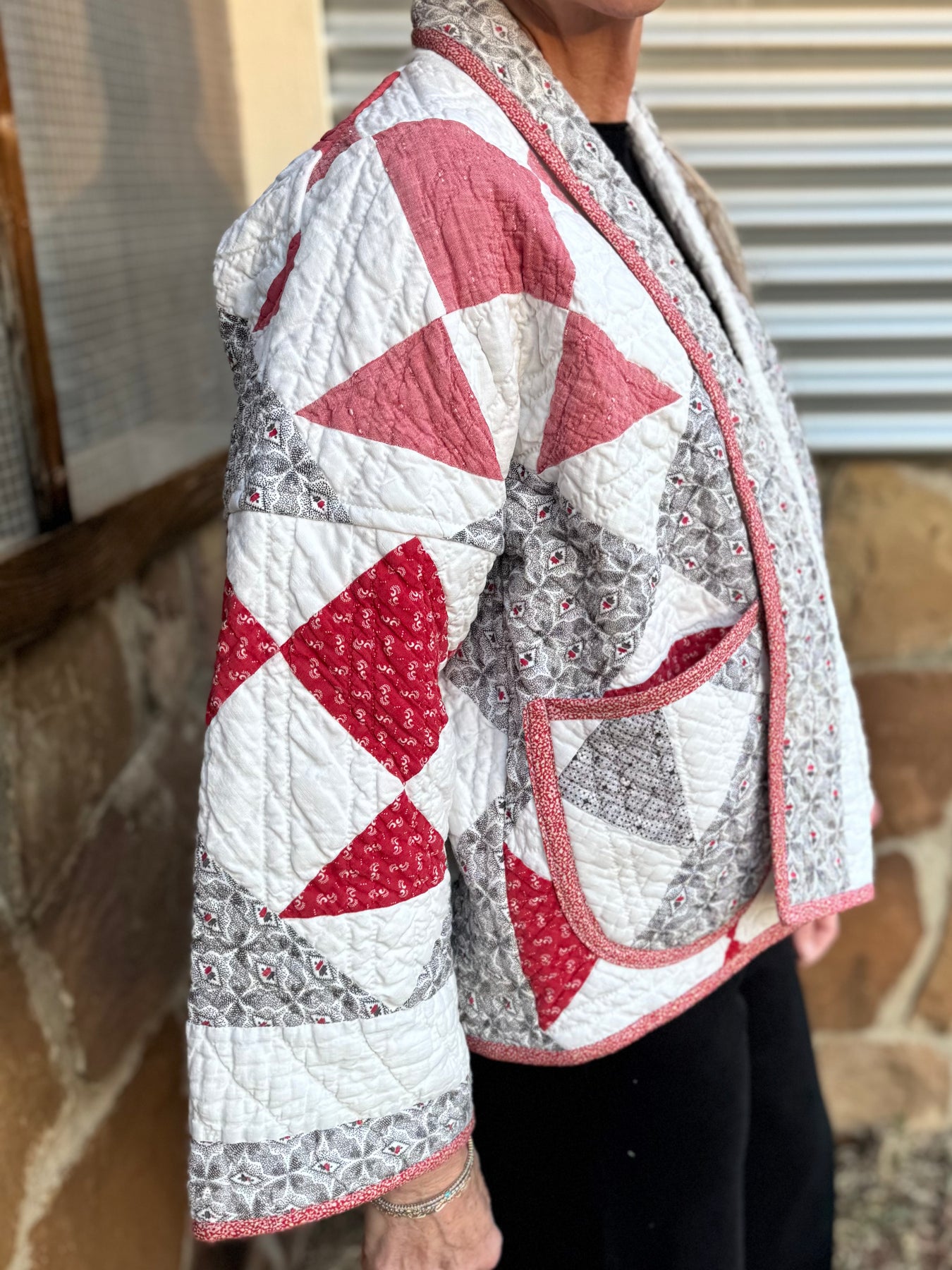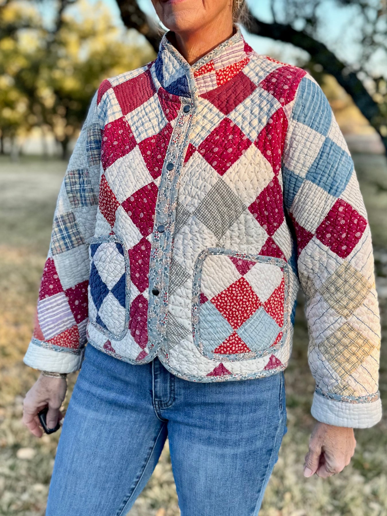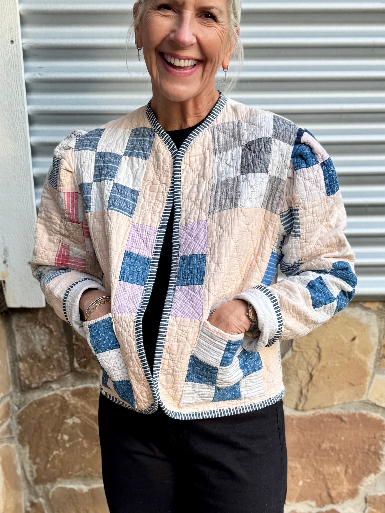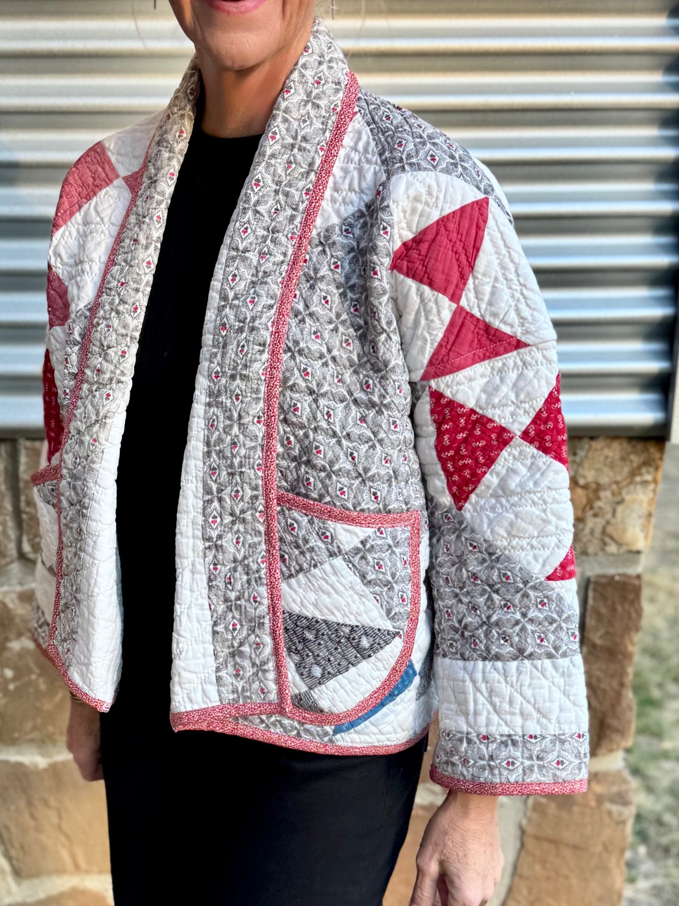 Made from a late 1800’s hand-pieced and hand-quilted patchwork quilt, this upcycled chore coat is replete with indigos, shirting fabrics, and calicos. It’s a medium/heavy weight jacket to keep the winter chill away.