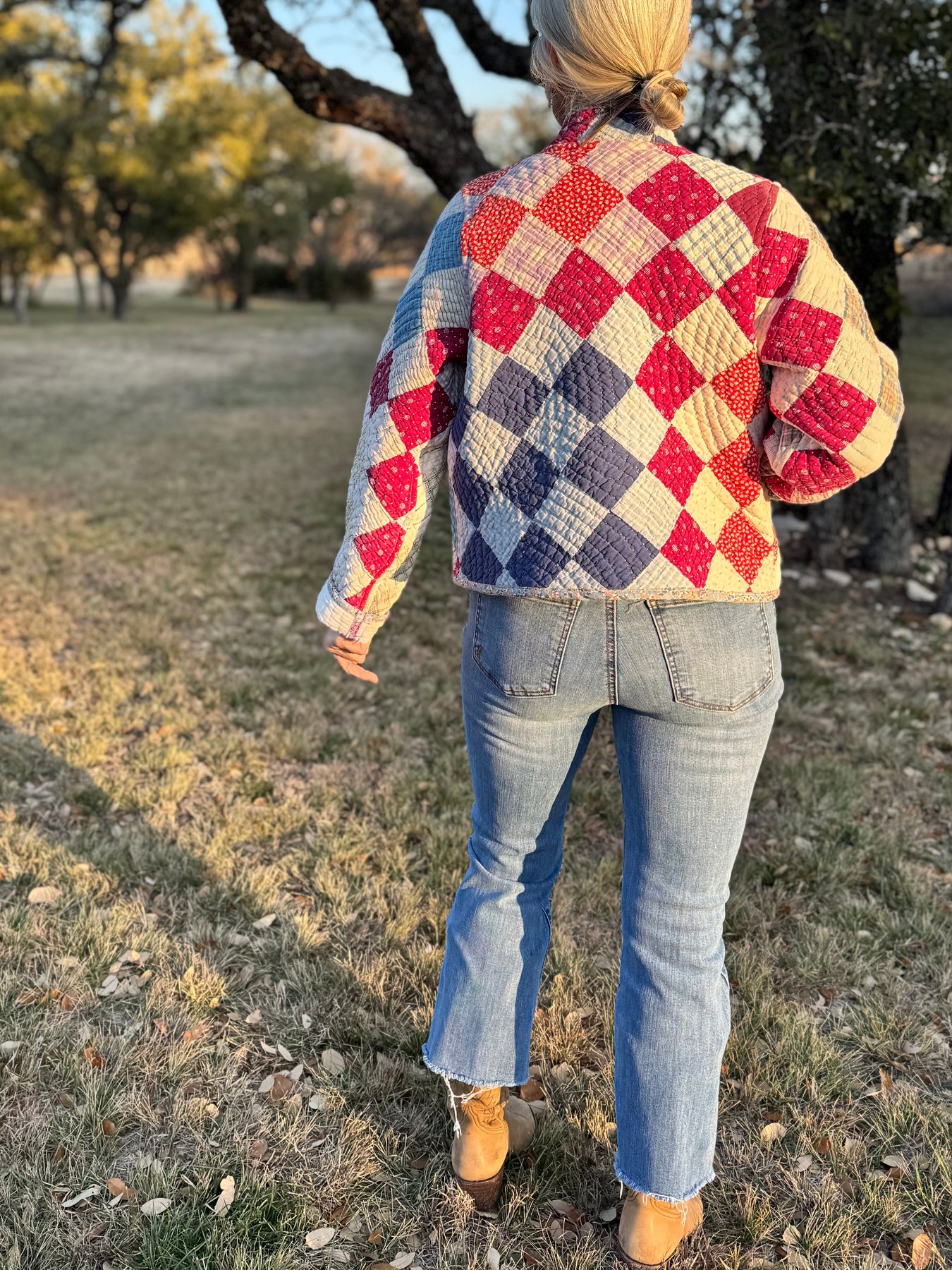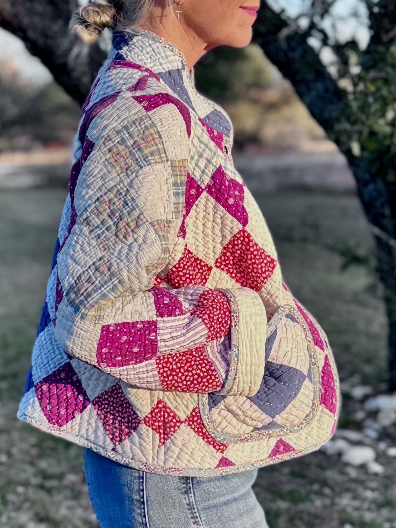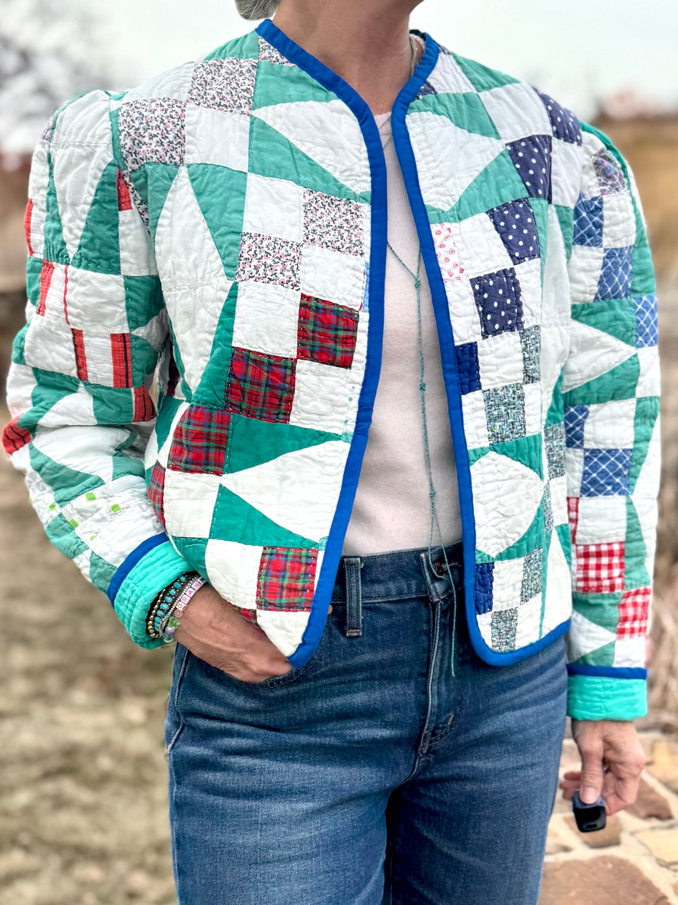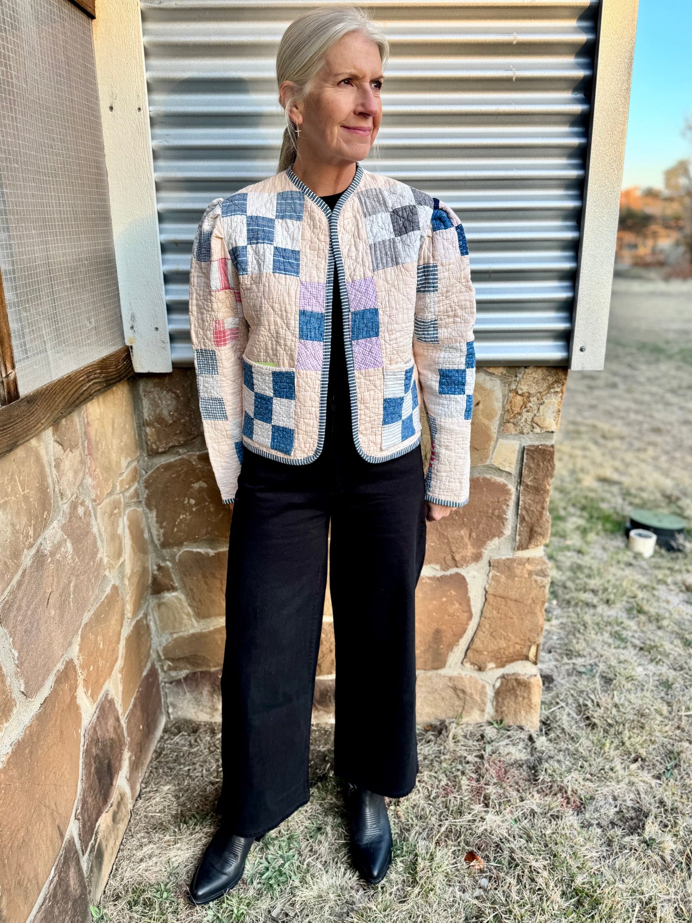 Made from a late 1800’s hand-pieced and hand-quilted patchwork quilt, this upcycled chore coat is replete with indigos, shirting fabrics, and calicos. It’s a medium/heavy weight jacket to keep the winter chill away.