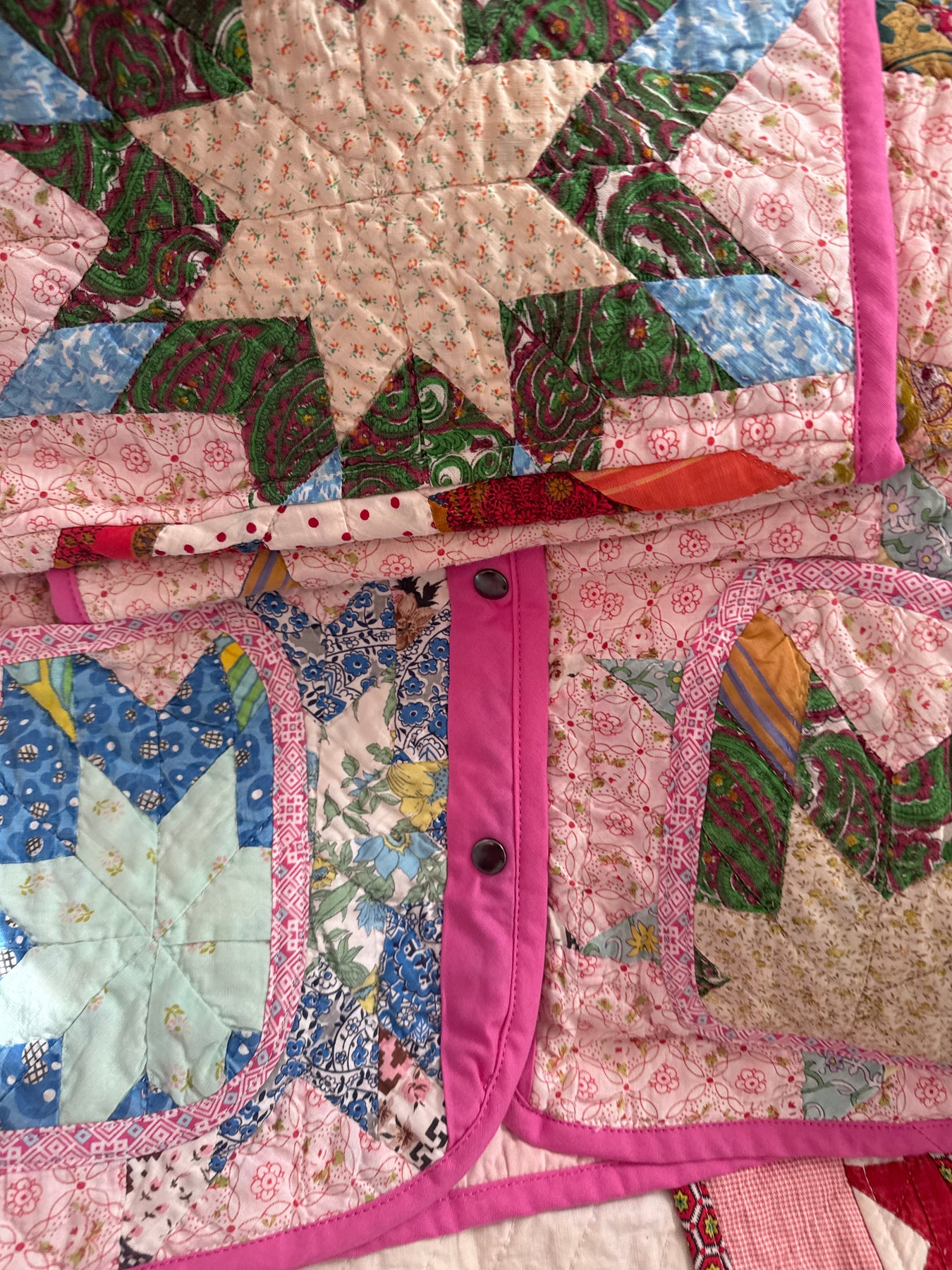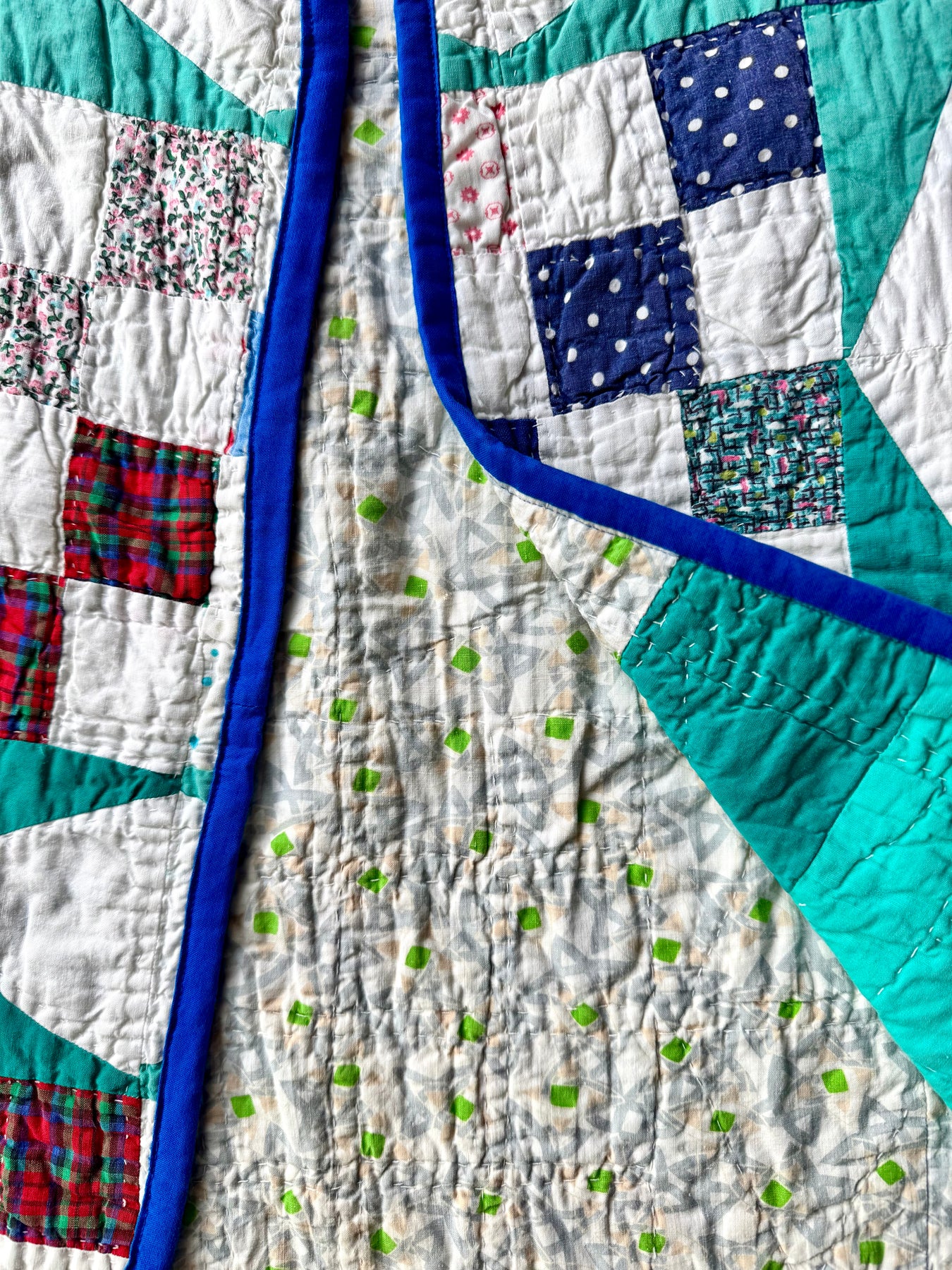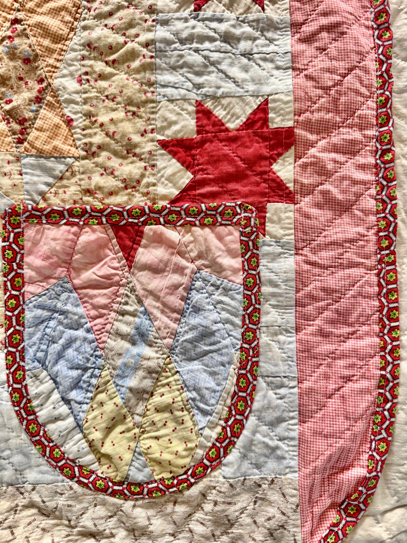 It boasts the imperfections, staining, and wear for a quilt of this era. The patterns, colors, stitches, and stains enfold treasured memories of days gone by.