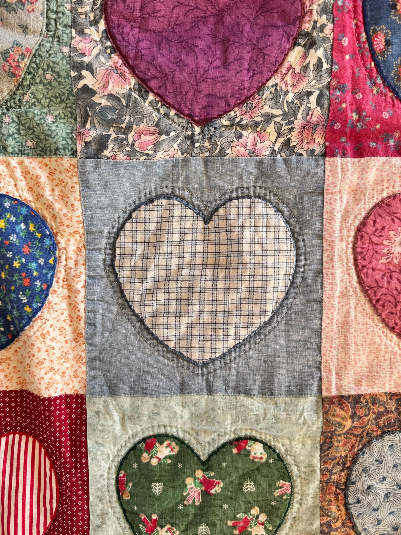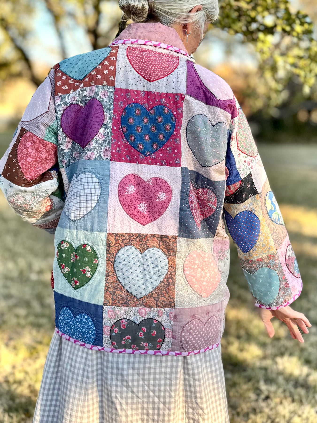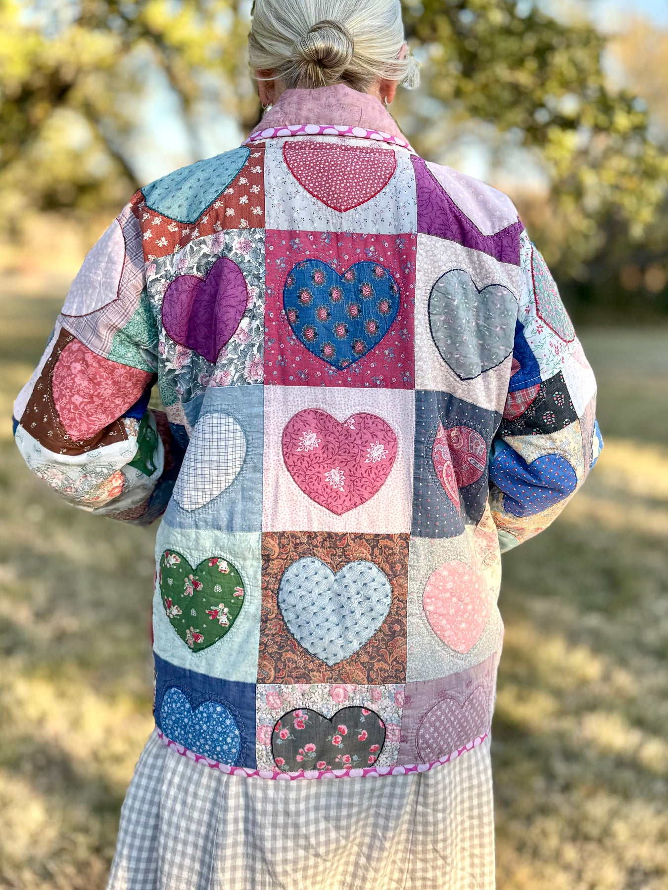 The patterns, colors, stitches, and stains enfold treasured memories of days gone by. They are characteristic of wearable artistry upcycled from vintage and antique textiles.