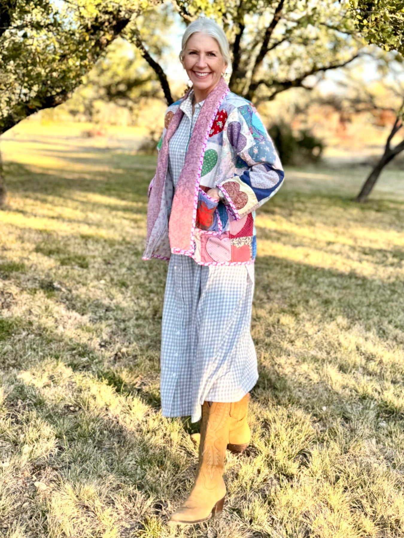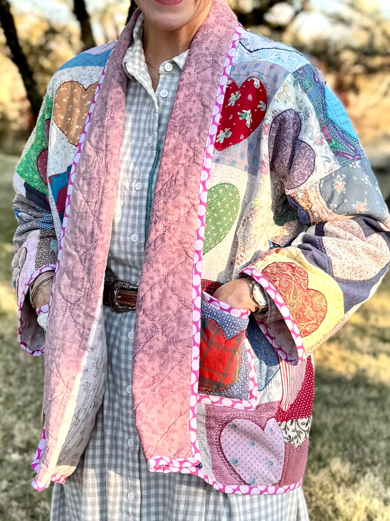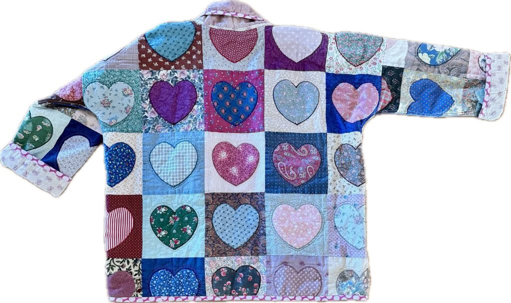 This adorable jacket is made from a whimsical heart appliqué quilt, presumed to be handmade in the 1980’s. Thoroughly cleaned by Throw and repurposed by gifted artist, Lottie Dal, she’s a true expression of love!